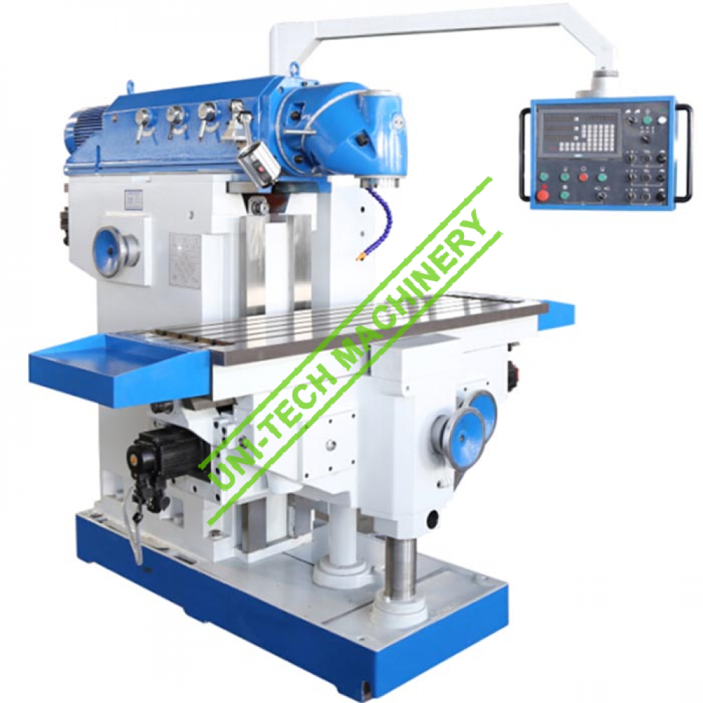 Main features: 1. Extra large work table and widetravel ranges on all axes 2. Rigid, torsion-proofconstruction with additional guide columns for constant precision whenmachining heavy workpieces 3. Universal swivel head – cuttercan be moved to any spatial angle 4. Fine-stepped spindle gears forpowerful machining 5. Dynamic, infinitely variablefeed and rapid feed driven by powerful, separate servo motors on every axes 6. Preloaded ball screws with zerobacklash for easy and precise feeds 7. Precise dovetail guides on Xaxis, wide square guides on Z axis 8. Swivelling control panel withintegrated position indicator simplifies operation 9. Central lubrication and LEDwork lamp are standard equipment